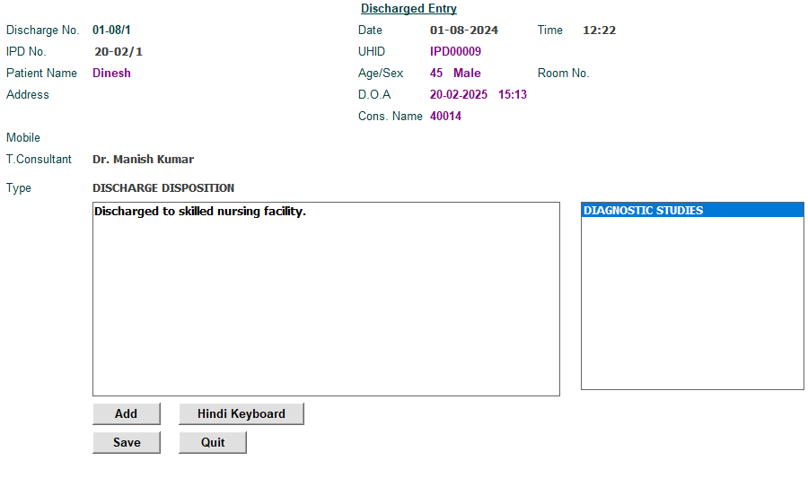- Define discharge type (e.g., Cured, Referred, Deceased)